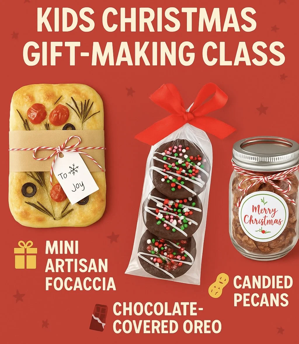 Kids will make three edible Christmas gifts: a mini artisan focaccia, chocolate-covered Oreos, and candied pecans! Each treat will be wrapped and ready to gift to someone they love.